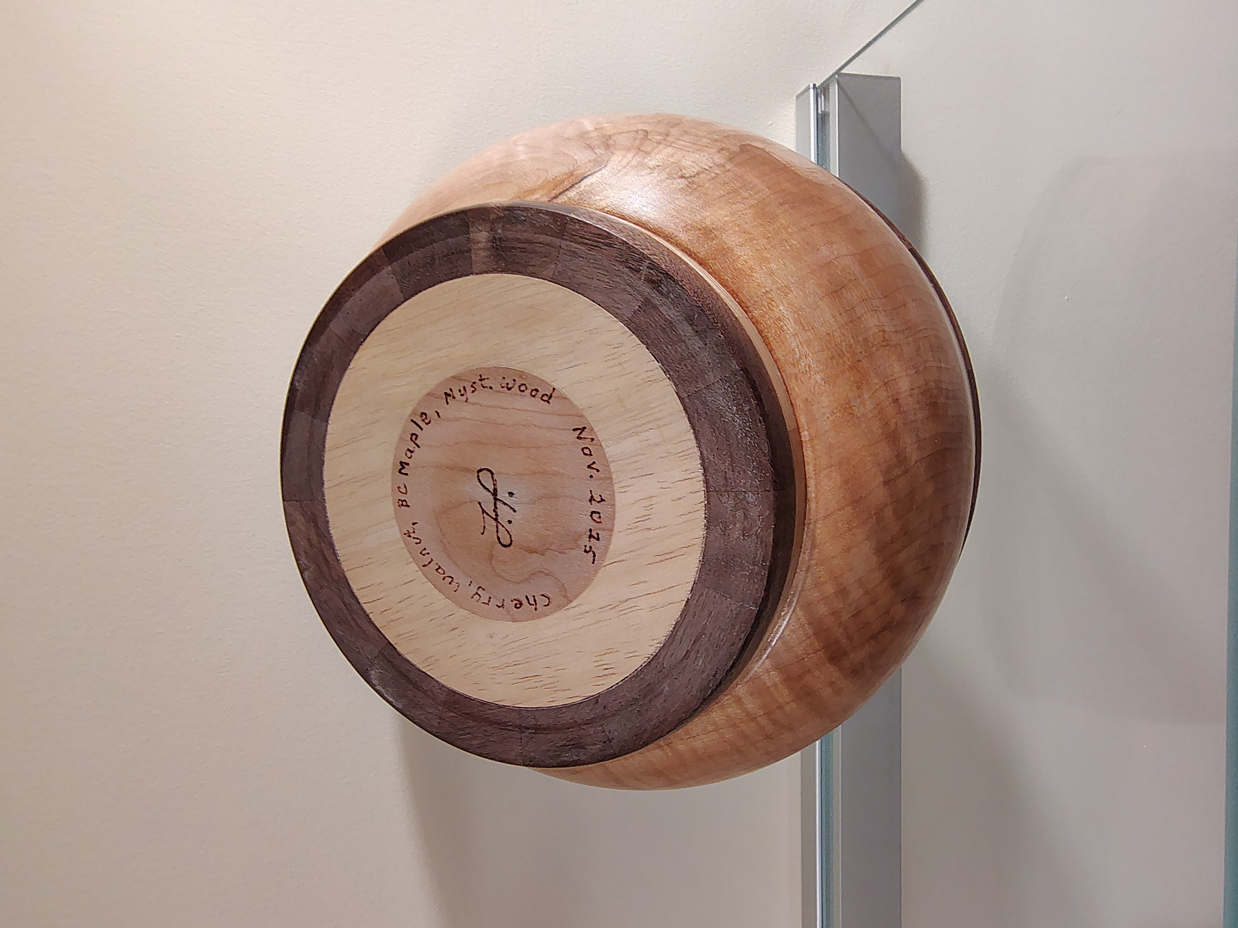 | This beautiful Bowl is made from; BC Maple with cherry and walnut rings. The base is what I think might be mahogany with an African blackwood center. | $200 CAD + Shipping, Walnut, Cherry, Mystery Wood & BC Maple Salad Bowl. 8 3/4" x 4.75 T x 4" Deep, | Email: howie.eb77@gmail.com |