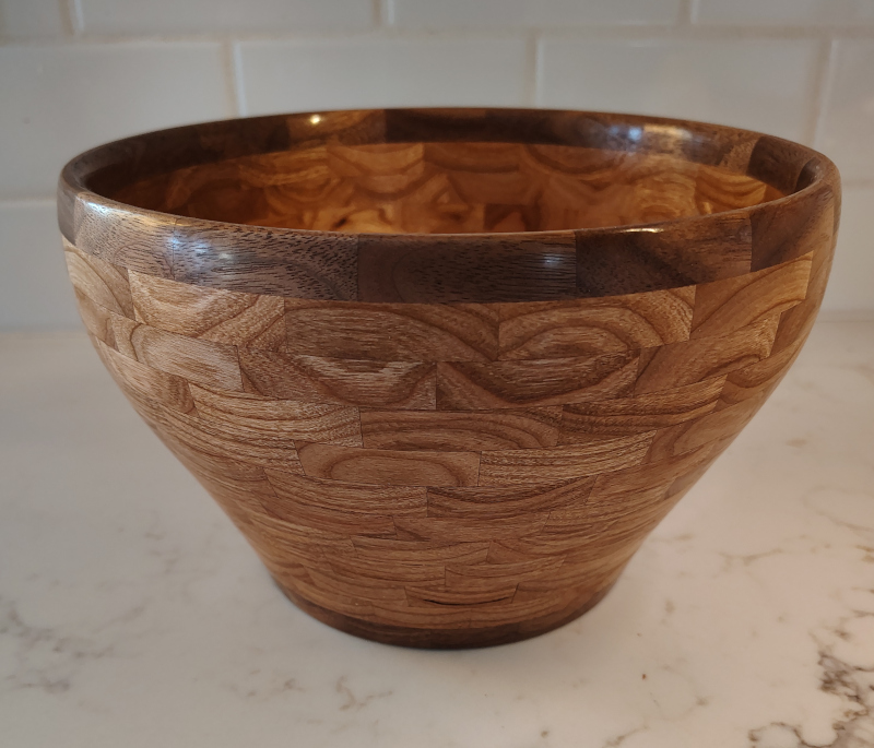 | Sorry This is Sold - I can make similar | $220 CAD + Shipping, Walnut & Maple Salad Bowl. 9" x 4.75 T x 4.5" Deep, 241 pieces | Email: howie.eb77@gmail.com |